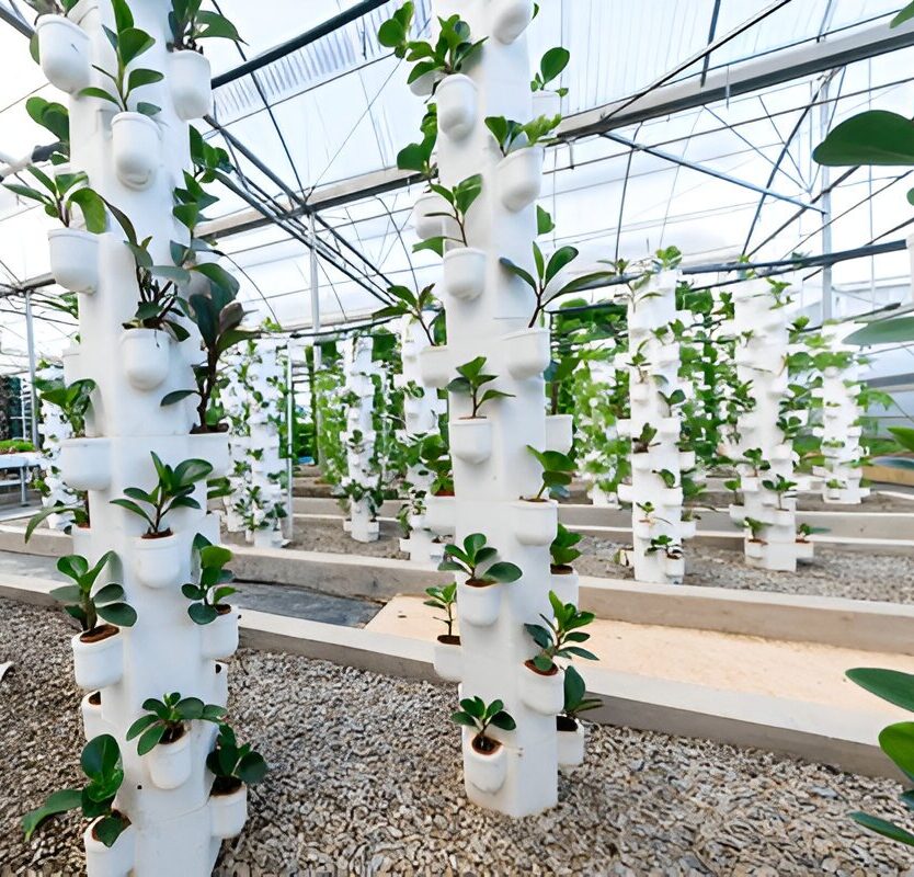 Plants are supported by growing ports, and water is pumped from a base reservoir to deliver nutrients directly to the root zone. With LED lighting and minimal maintenance, towers produce fast-growing, clean, and chemical-free food.